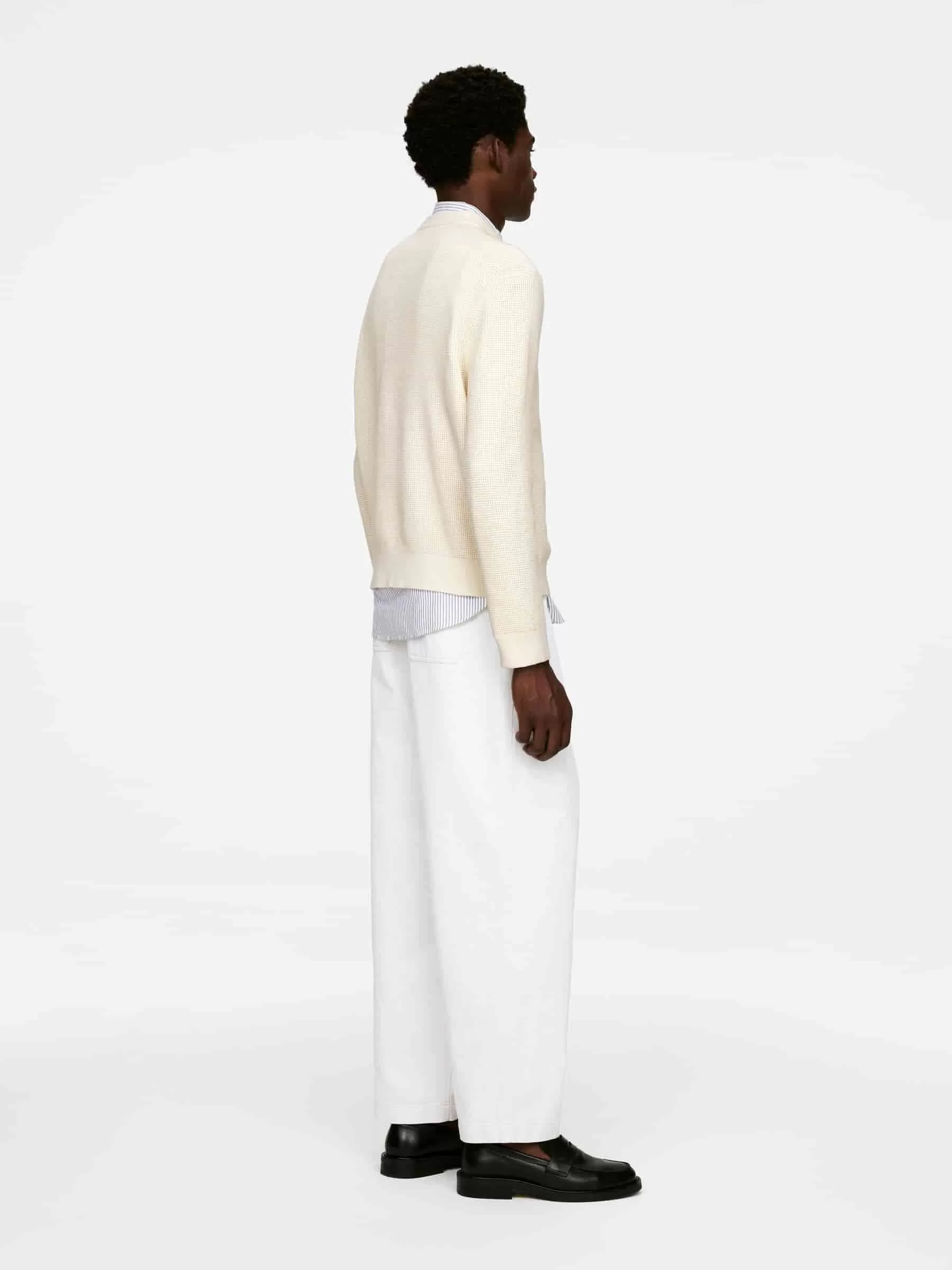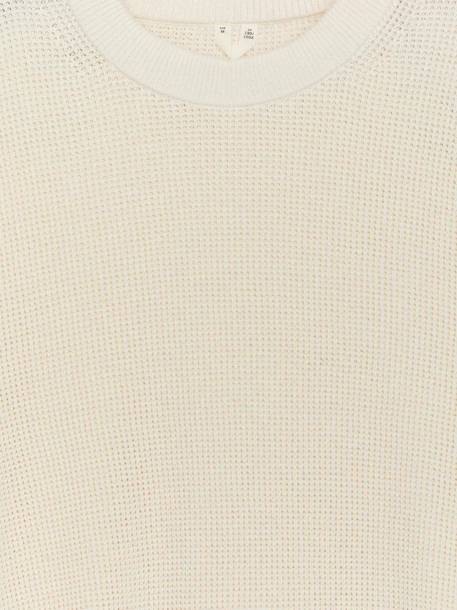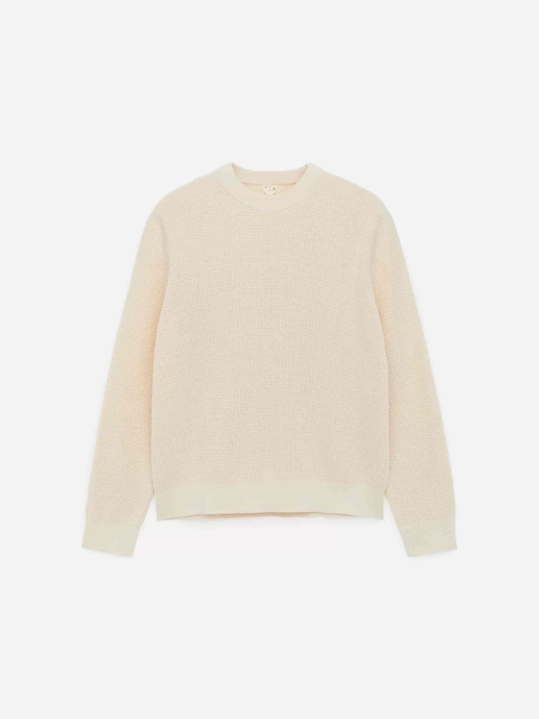 Tröja gjord av en blandning av bomullslinne, stickad med våffelstruktur. En crewneck-stil i normal passform. Ribbstickade beslag.